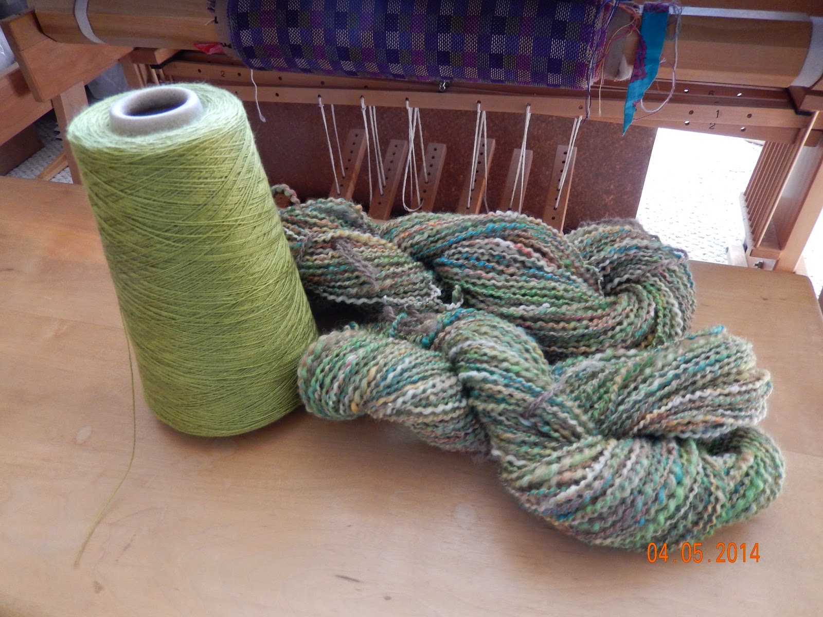 I got the purple/green yarn warped and found that I had three weft choices. I was stumped because I liked them all, so I called my color consultant to come upstairs and give me a second eye. Ian has really great color sense and said - green!